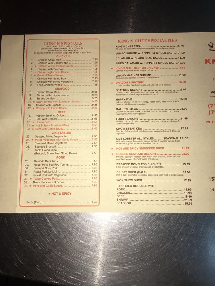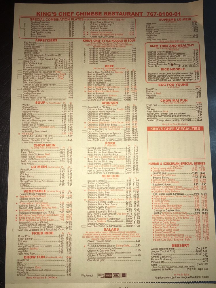 Introducing the menu at King's Chef Chinese Restaurant, a Chinese dining experience located at 15327 Cross Island Pkwy in Whitestone, NY. This restaurant offers a wide range of options for diners, including delivery, takeout, reservations, and catering services. With a focus on quality and taste, King's Chef provides many vegetarian choices and is praised by customers for its delicious food. Reviewers like Ken G. and Jeannine M. mention the great food quality and service, making it a go-to spot for Chinese cuisine. Ovon D. raves about the tender G Tsos chicken and well-prepared egg rolls. Despite being somewhat pricey, the delicious dishes and efficient service make King's Chef Chinese Restaurant worth a visit. With options for dining in or picking up, this establishment caters to a variety of preferences, ensuring a memorable dining experience for all.